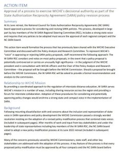 In June 2022, the NC-SARA Board adopted a revised process for making changes to SARA Policy -- the SARA Policy Modification Process. This process will go into effect starting in January 2023. This new process reflects the following guiding principles: transparency; collaboration; consistency; and clear and open communication among regional compacts, states, institutions, NC-SARA, and other stakeholders. The Regional Steering Committee and Regional Compact play a pivotal role in in the new policy modification process. Per Section 8.2 in the SARA Policy Manual, each Regional Compact is adopting and publishing a transparent process for their review (with their respective Regional Steering Committees) of proposed SARA Policy modifications. The W-SARA regional approach to policy proposal review can be found here.