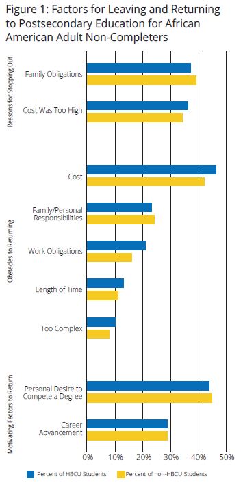 Through focus groups and surveys of about 1,000 African American adult non-completers, of which 250 attended HBCUs, 66 percent of the former HBCU students have some college but no degree, while 34 percent have an associate’s degree – a similar proportion to the non-HBCU non-completers surveyed. For the purpose of this PLA analysis, the most relevant information was about reasons for stopping out, obstacles to returning, and reasons that those surveyed might return (see Figure 1).