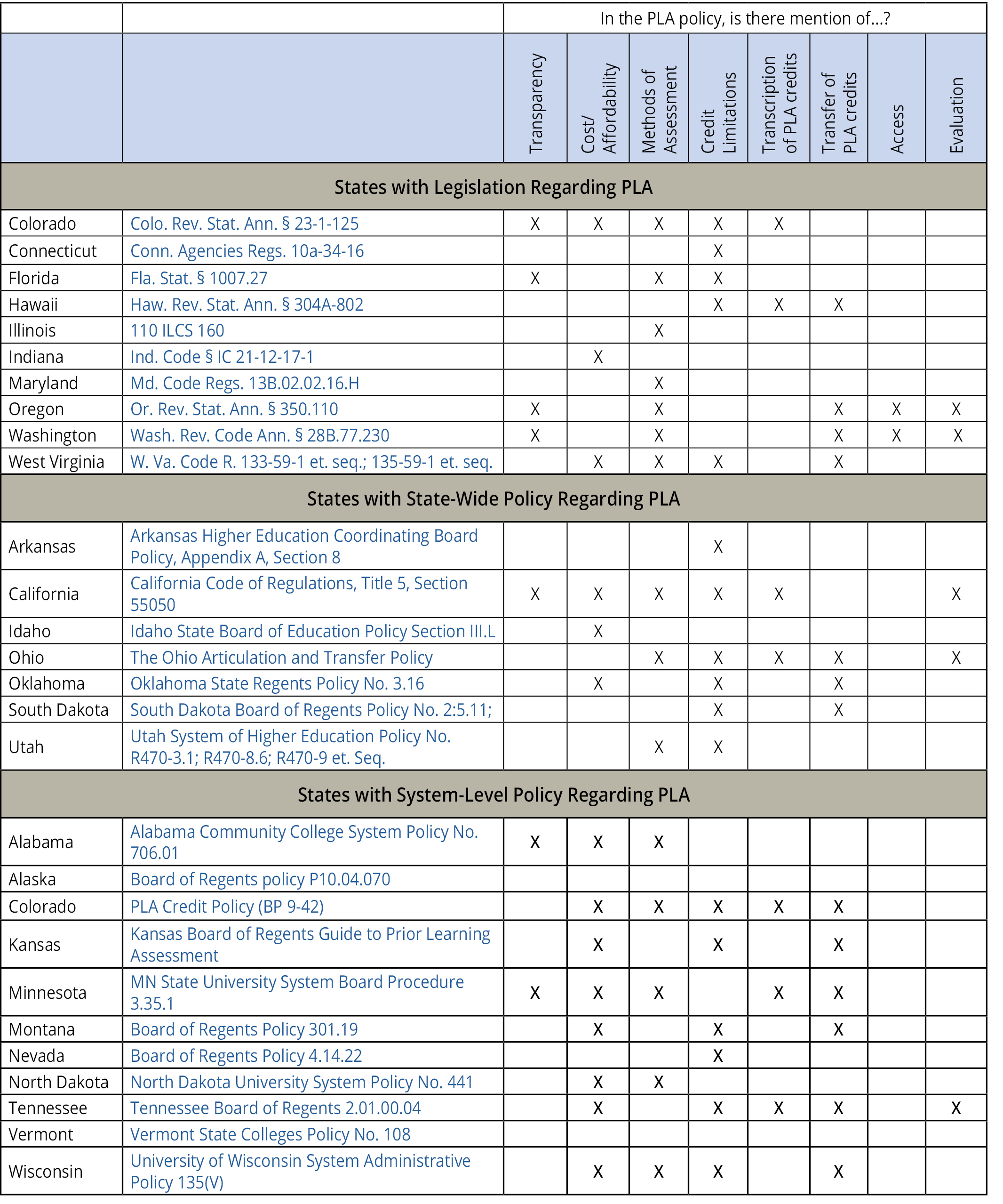 Despite similarities among states regarding their PLA policies, most policies differ from each other (with the exception of Washington and Oregon statutes on PLA, which are mirror images of each other) due to state context. Some state statutes such as those in Hawaii and Illinois, while requiring institutions to implement PLA policies, offer little guidance to institutions as to what should go in said policy. Other states such as Oregon and Washington and systems such as the California Community College System offer institutions more detailed guidance in creating and implementing their PLA policies. Thus, the state examples found in these resources as well as the links in Table 1 to the actual policies will be helpful to any policymakers considering crafting and implementing state policy and legislation.