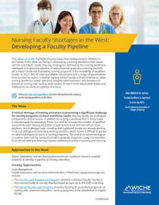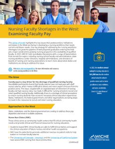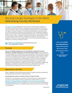 This series of briefs highlight the challenges that institutions and states in the West are facing in recruiting and retaining qualified nursing faculty and clinical preceptors and highlights the strategies that states, institutions, and the federal government are implementing to address these challenges. Several key issues were described by roundtable participants related to the ability to recruit and retain nursing faculty, such as the pay disparity between nursing faculty and staff nurses, the workload of nursing educators, limited clinical preceptors, and the ability to develop the pipeline of future nursing educators.