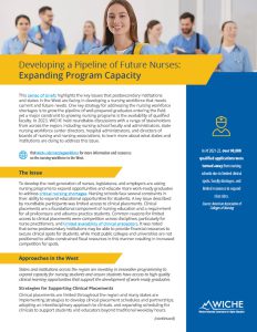 This brief looks at challenges nursing schools face in accessing clinical placements for students across all levels of nursing and highlights strategies used by institutions, states, and federal government are implementing to help expand capacity to enroll and educate more students.