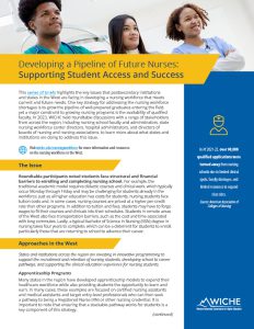 This series of briefs highlight the challenges that institutions and states in the West are facing in expanding access and capacity at nursing schools across the West. A key issue institutions face in expanding capacity for nursing students is shortages in clinical placements for students across all levels of nursing. Roundtable participants also shared that students face structural and financial barriers to accessing and succeeding in nursing school. These briefs highlight strategies used by institutions, states, and federal government to support the development of the next generation of the nursing workforce.